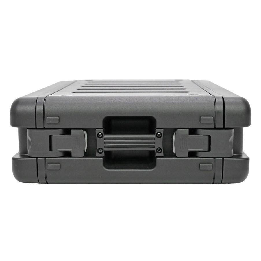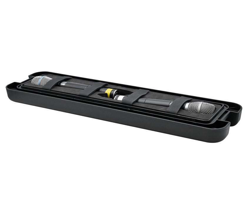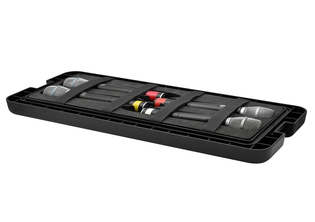 Inclou plataformes amb rodes per al transport de múltiples unitats, tapes amb escuma troquelada per protegir micros i cables, i bosses interiors per organitzar accessoris.